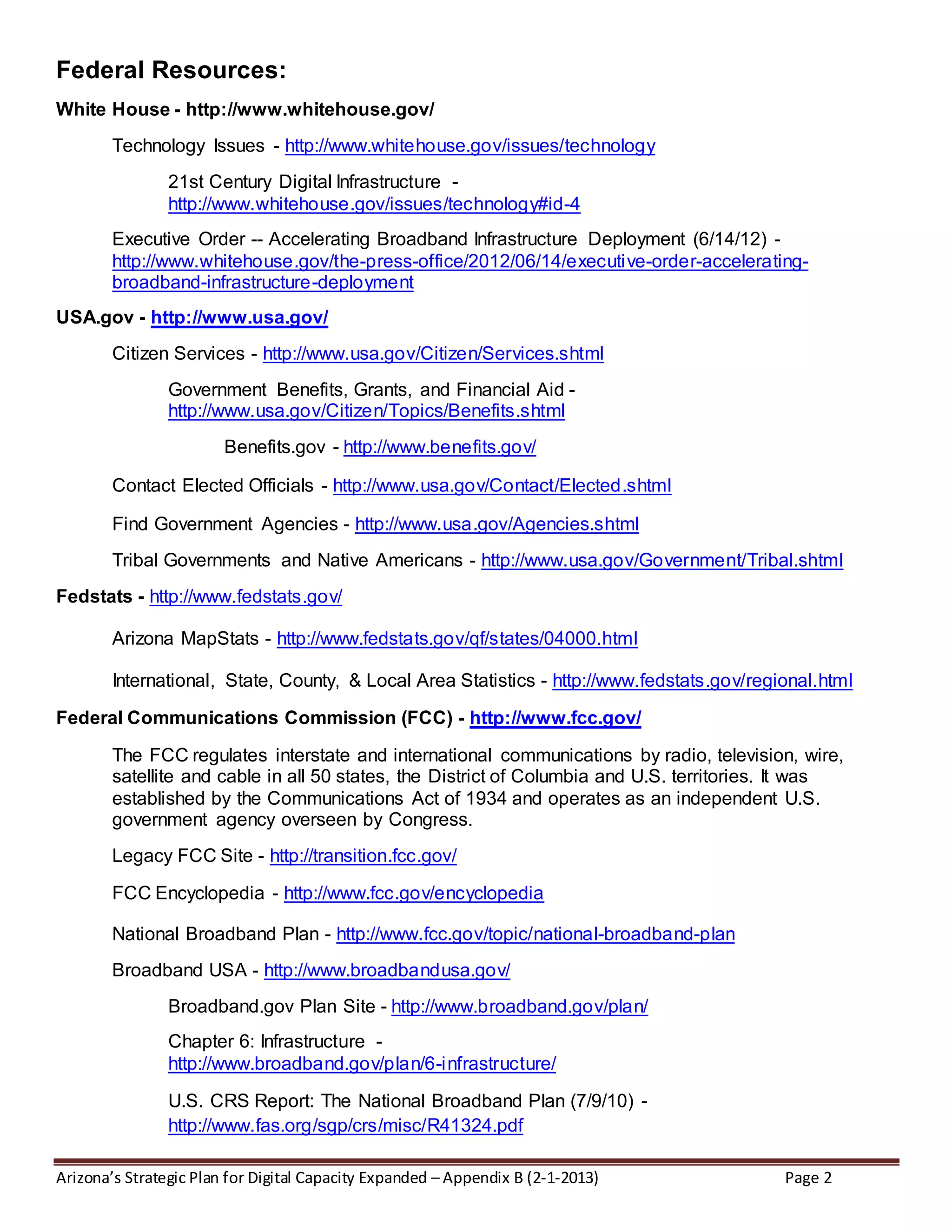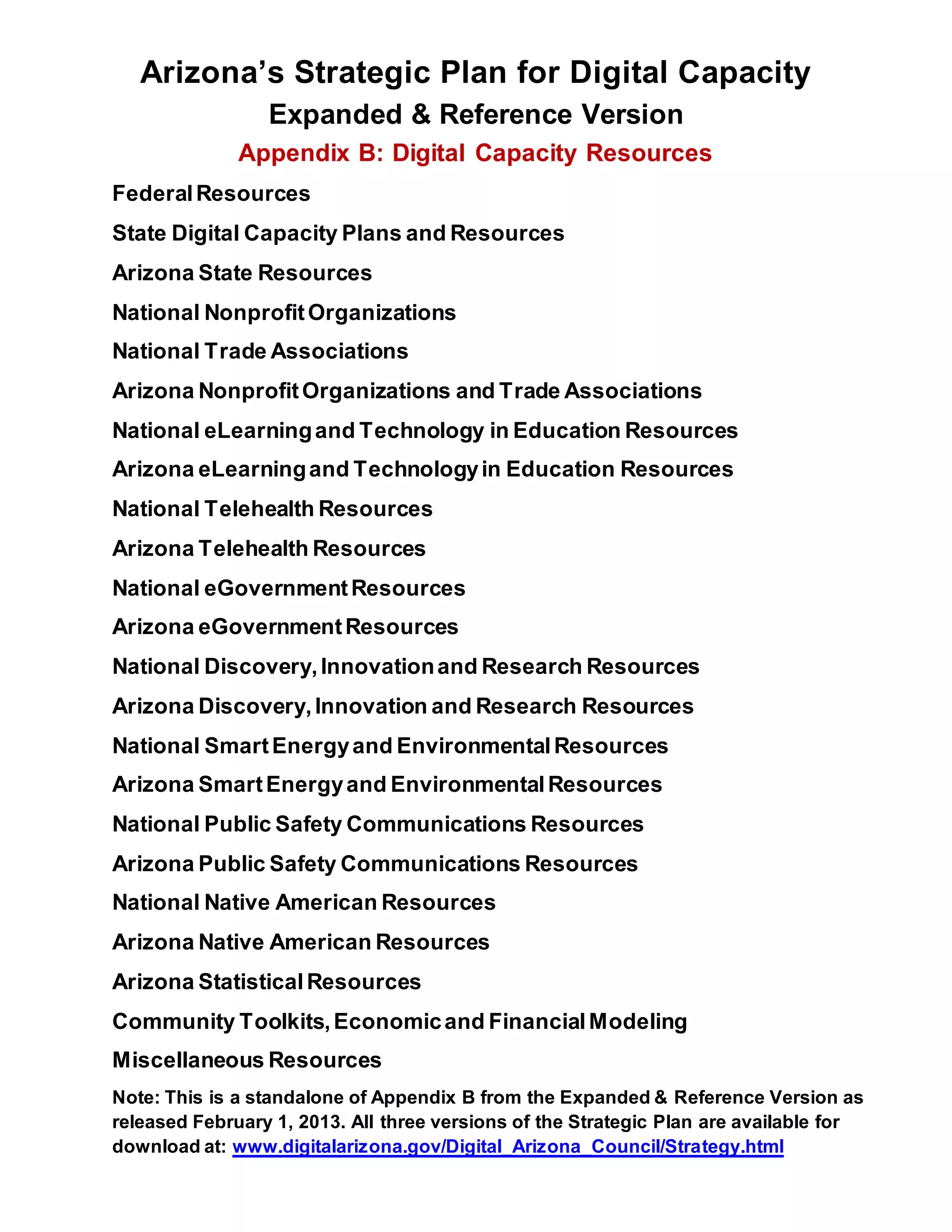 Arizona's strategic plan for digital capacity outlines various federal and state resources, national and local nonprofit organizations, and educational and telehealth resources aimed at enhancing digital infrastructure. It serves as a comprehensive guide for improving broadband access and digital literacy across the state. The document also provides links to multiple government and organizational resources related to technology and telecommunications.