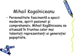 Mihail Kogălniceanu, o personalitate marcantă a epocii moderne, a fondat revista Dacia Literară pe 30 ianuarie 1840 la Iași, în contextul procesului de modernizare a principatelor. Revista nu s-a concentrat exclusiv pe literatură, ci a promovat idealurile pașoptiștilor, incluzând combaterea imitației și dezvoltarea unei literaturi naționale. În primul număr, Kogălniceanu a enunțat programul revistei, care cuprindea patru puncte fundamentale pentru dezvoltarea culturală națională.