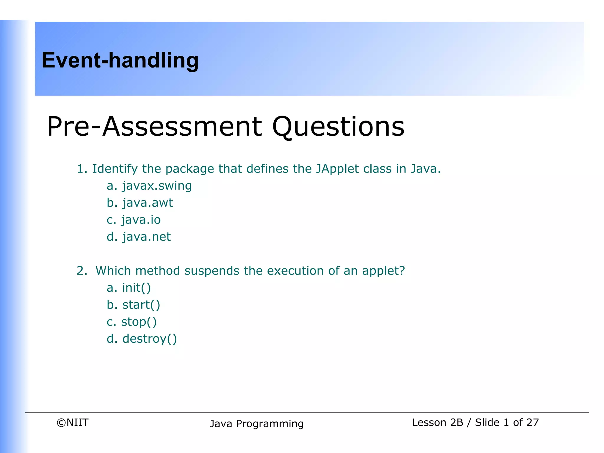 This document discusses event handling in Java. It covers event classes like ActionEvent and MouseEvent which describe changes in GUI components. Listeners register with sources to receive event notifications. The delegation model allows specifying objects to notify for specific events. Common sources and event types are described. Interface and adapter classes support defining event handler methods.