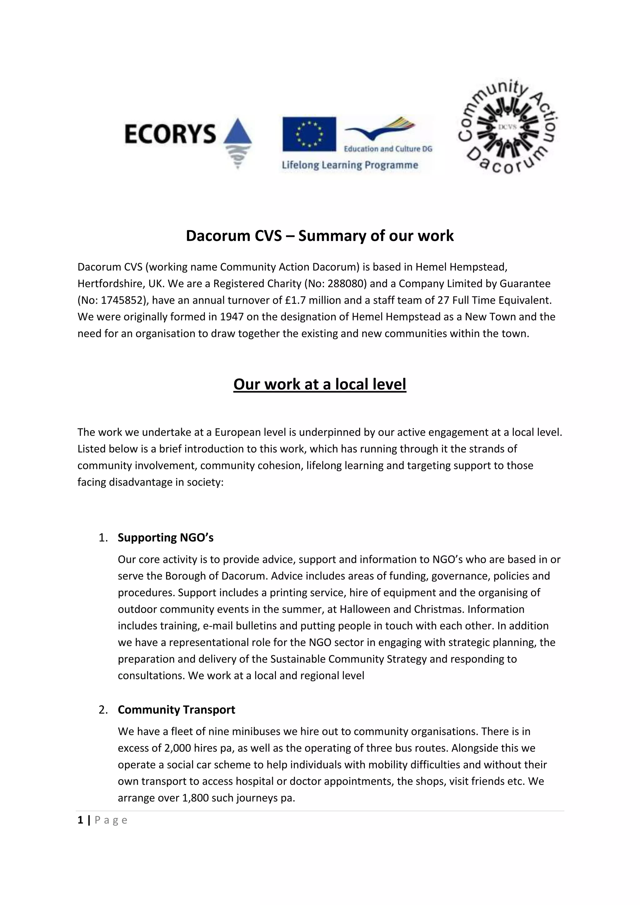 Dacorum CVS is a registered charity and company limited by guarantee located in Hemel Hempstead, UK with an annual turnover of £1.7 million. It provides services to support local NGOs and communities, including community transport, interpreting and translation services, education programs, furniture reuse, and training courses. It has also been involved in several European projects since 1997 related to issues like workers' mobility, use of structural funds, corporate social responsibility, active citizenship, and senior volunteering.
