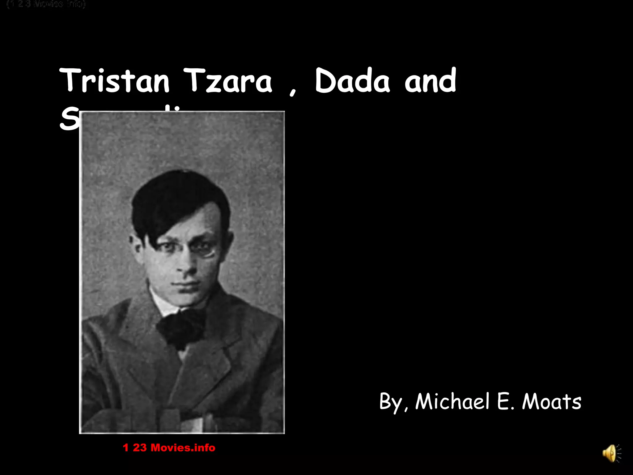 Tristan Tzara was a Romanian poet and writer who was a major figure in founding the Dada art movement in reaction to World War 1. He collaborated with other artists in Zurich to establish Cabaret Voltaire in 1916, which helped launch Dada. Dada began as a literary genre but soon expanded to performance and visual arts. The movement spread to other cities and countries, involving many influential artists before eventually evolving into Surrealism led by Andre Breton in the 1920s. Tzara made important contributions to Dada and avant-garde art through his writings, performances, and leadership before his death in 1963.