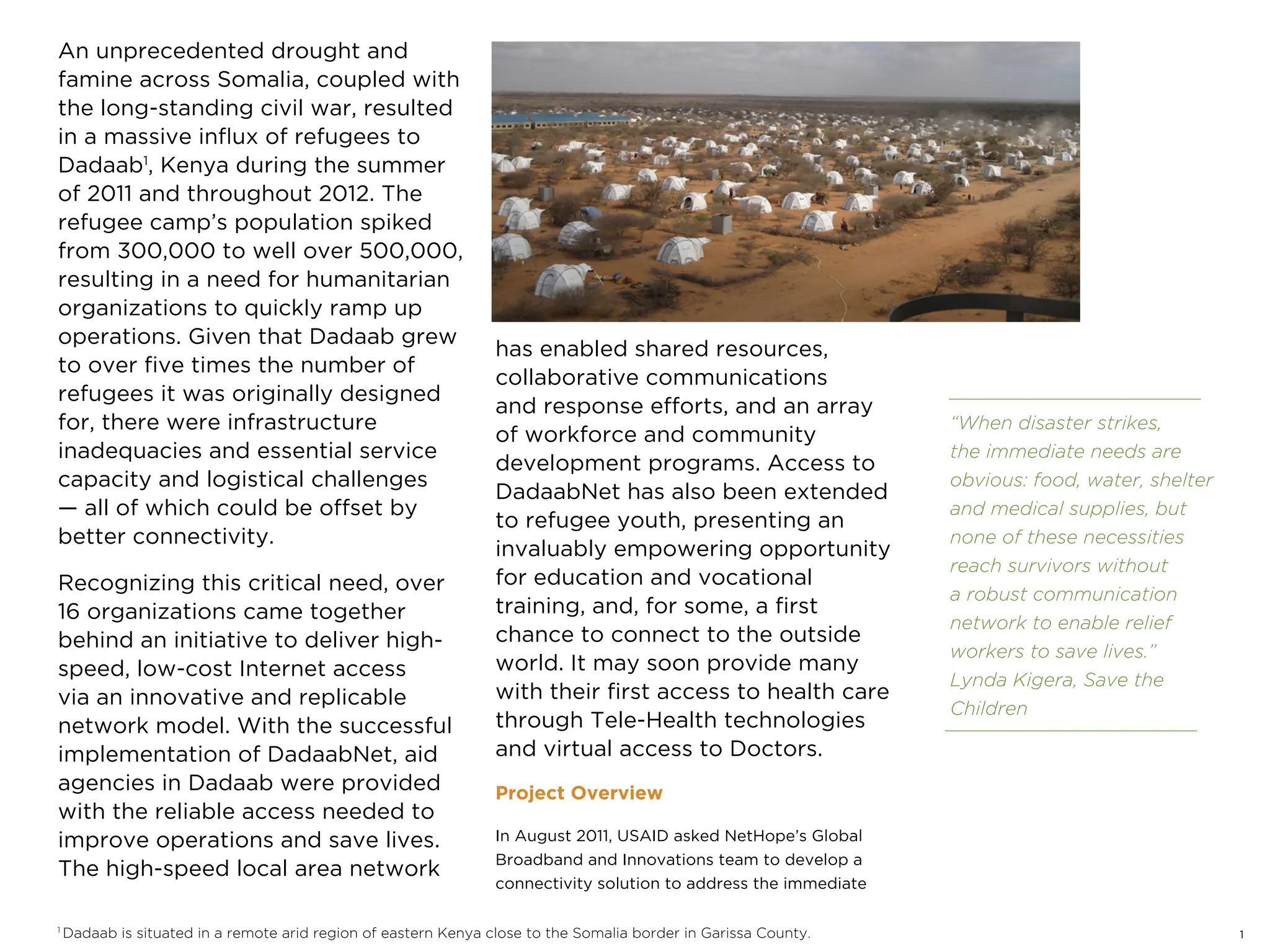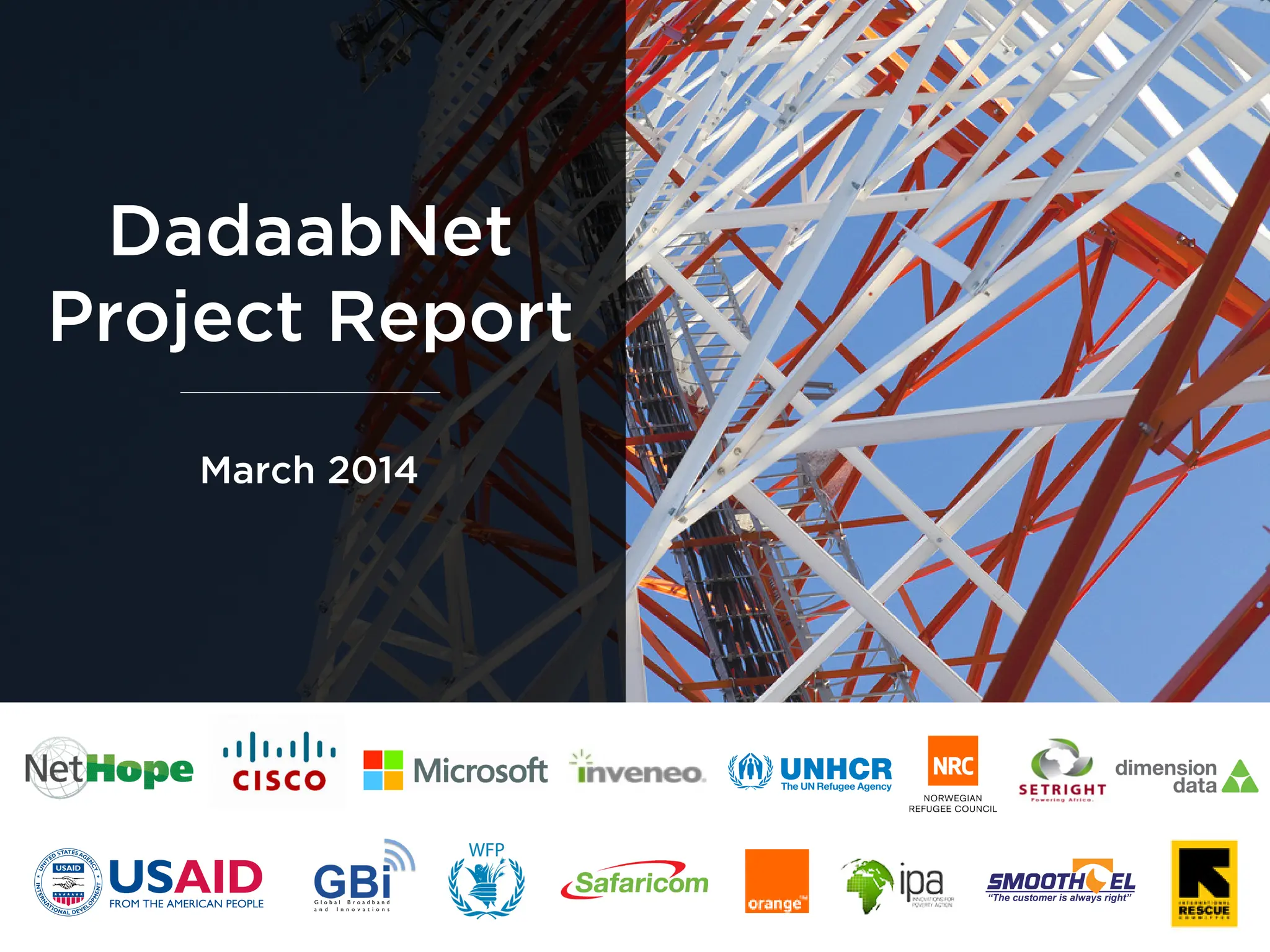 An influx of refugees into Dadaab refugee camp in Kenya from Somalia overwhelmed existing infrastructure and services. In response, over 16 organizations collaborated to create DadaabNet, a high-speed wireless network, to improve connectivity and coordination between organizations. DadaabNet provided reliable broadband access, enabling information sharing, coordination of relief efforts, and educational and vocational programs. It has since been expanded and transitioned to local management to ensure sustainability.
