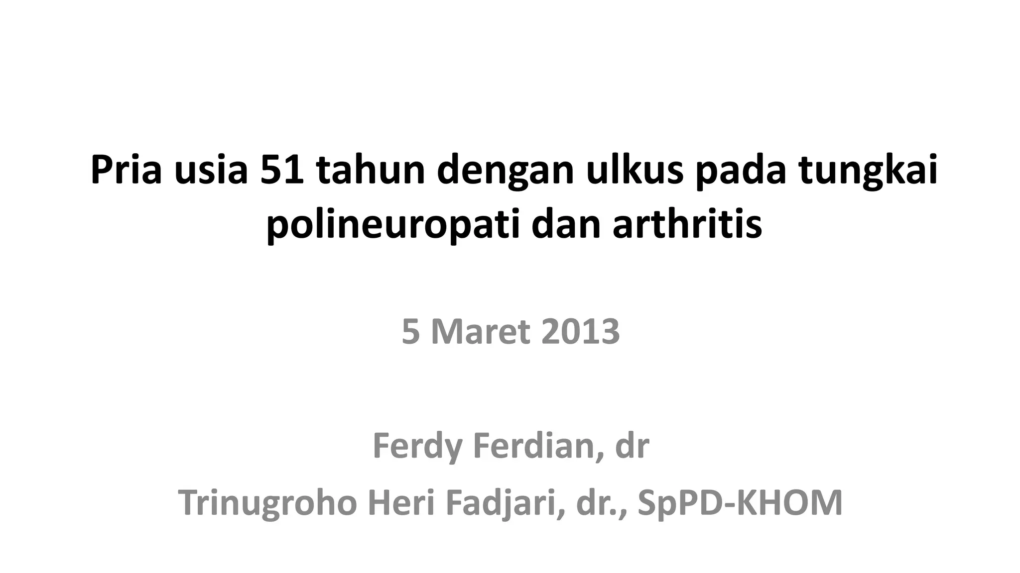 Pasien berusia 51 tahun dengan keluhan utama nyeri dan kelemahan pada kedua tungkai serta sendi, yang didiagnosis menderita pioderma gangrenosum, polineuropati subakut, dan osteoarthritis genu bilateral berdasarkan gejala klinis dan pemeriksaan fisik.