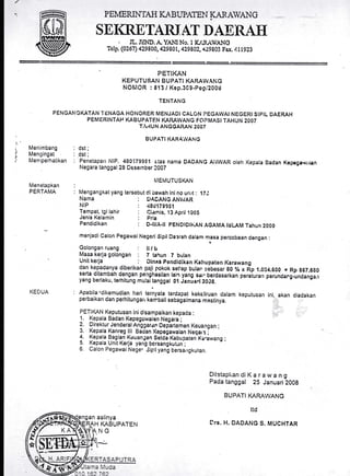 Dokumen ini berisi keputusan bupati Karawang mengenai pengangkatan tenaga honorer menjadi calon pegawai negeri sipil. Beberapa pegawai disebutkan berserta informasi terkait pendidikan, jabatan, dan gaji pokok yang diterima. Selain itu, dokumen juga mencakup prosedur penetapan dan perbaikan jika terdapat kekeliruan dalam keputusan.
