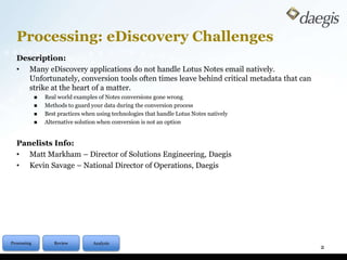 The document discusses the challenges of processing Lotus Notes data for eDiscovery, highlighting issues such as metadata loss during conversion and the complexity of various applications within Lotus Notes. It offers best practices for effective data management, including the importance of retaining and classifying data, as well as avoiding technology that relies on flawed conversion methods. Additionally, it emphasizes the need for thorough understanding of the different types of data within Lotus Notes to ensure accurate processing and compliance with legal holds.