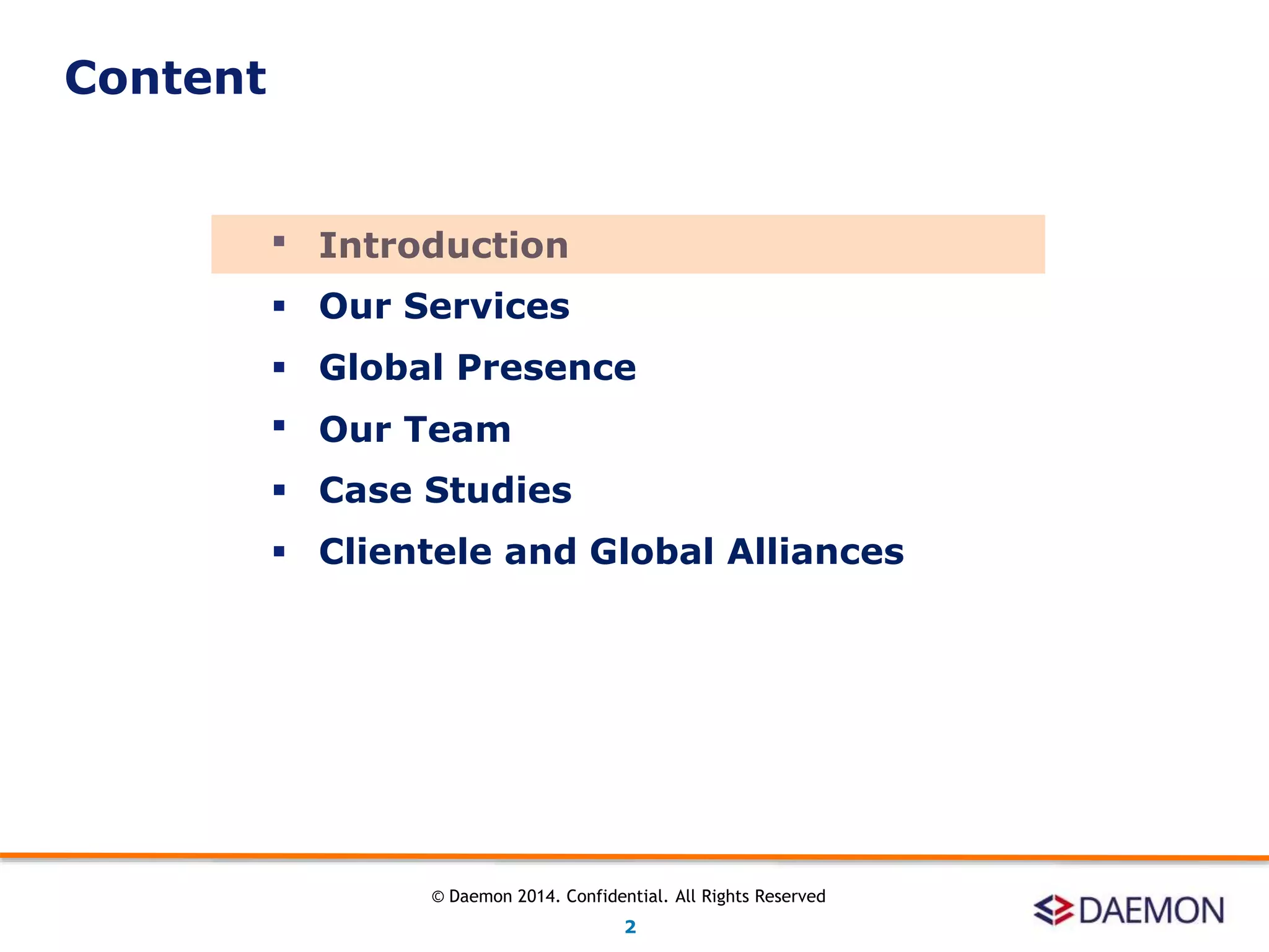 Daemon is a global IT solutions and services provider headquartered in Singapore with over 200 employees globally. It has delivery centers in India and a presence across 10 countries. Daemon provides services including Oracle products, Siebel CRM, billing, mobility, and custom development. It aims to help clients innovate and achieve success through its people-process-tools approach and domain expertise across telecom, banking, and other industries. Daemon has a vision to be a respected global IT solutions provider known for its consulting, technology, and talent quality.