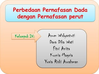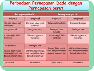 Pernapasan dada melibatkan kontraksi otot antar tulang rusuk sehingga menyebabkan tulang rusuk naik dan volume rongga dada membesar ketika masuk udara. Pernapasan perut melibatkan pergerakan diafragma turun yang menyebabkan volume rongga dada membesar ketika masuk udara. Perbedaan utama antara dua jenis pernapasan ini adalah otot yang terlibat yaitu otot antar tulang rusuk untuk pernapasan dada dan diafragma untuk