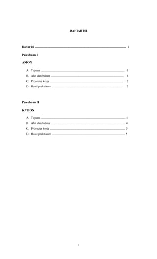 This document outlines two experiments on identifying anions and cations. The first experiment details identifying anions and lists its purpose, materials, procedures, and results. The second experiment is on identifying cations and also lists its purpose, materials used, procedures, and results sections. Both experiments provide information on qualitative chemical analysis of ions in samples.