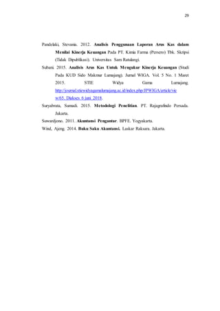 Dokumen ini adalah daftar pustaka yang mencakup berbagai tulisan tentang analisis laporan keuangan dan arus kas dari berbagai penulis dan sumber. Beberapa studi kasus yang disebutkan berfokus pada kinerja keuangan perusahaan di Indonesia. Juga termasuk referensi terkait standar akuntansi dan metodologi penelitian dalam akuntansi.