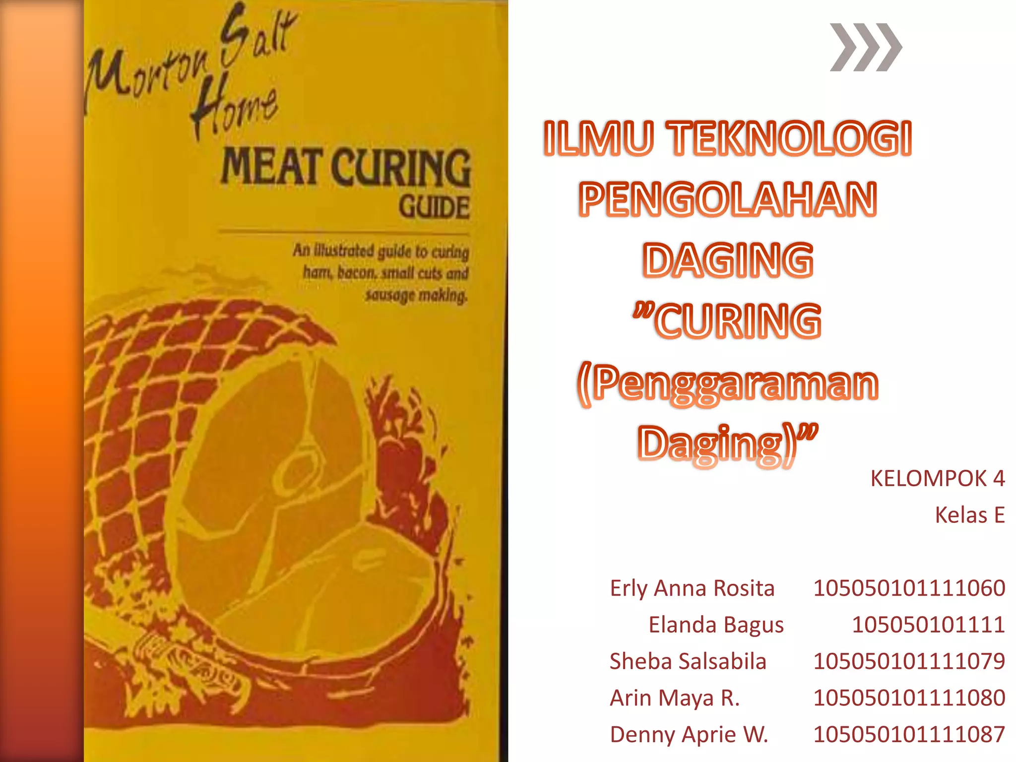 Dokumen tersebut membahas tentang proses curing (penggaraman) pada daging dengan menambahkan bahan seperti garam, nitrat, nitrit, dan gula. Proses curing bermanfaat untuk memperpanjang masa simpan daging dan memberikan warna merah pada daging. Dokumen ini juga membahas perubahan komposisi kimiawi daging selama proses curing.