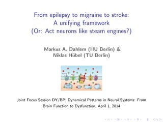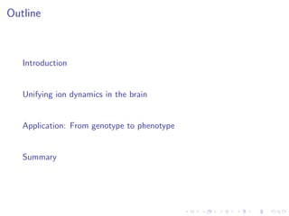 The document presents a unifying framework for modeling ion dynamics in the brain that can explain phenomena seen in epilepsy, migraine, and stroke. It introduces a second generation of Hodgkin-Huxley type models that account for ion concentrations and pumping/buffering dynamics in addition to membrane voltage dynamics. These models exhibit bistability between polarized and depolarized states, depending on parameters. The framework aims to provide a common mechanistic explanation for different neurological disorders based on shifts between stable states induced by genetic or external factors.