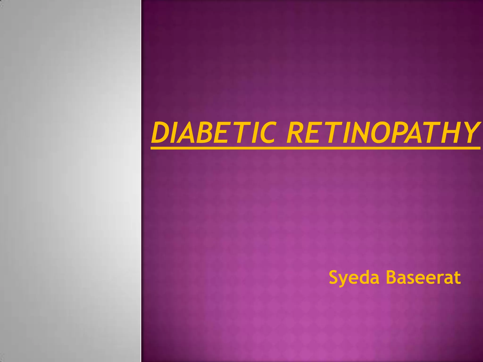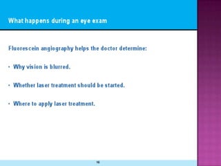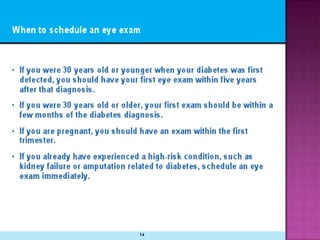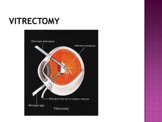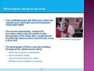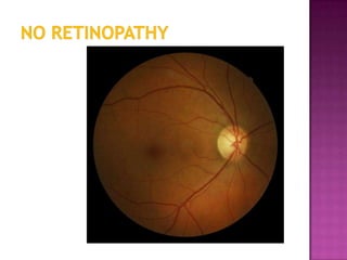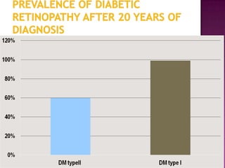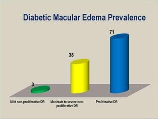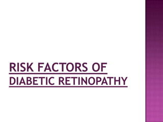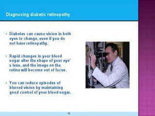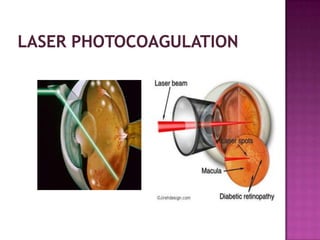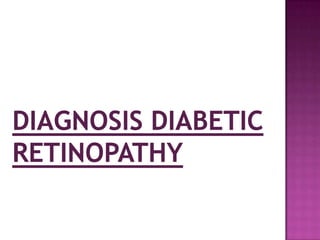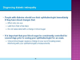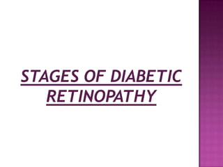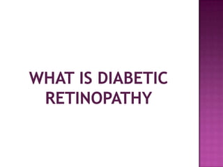 Diabetic retinopathy is a leading cause of blindness that results from damage to the blood vessels of the retina due to complications of diabetes. It can progress from mild nonproliferative retinopathy, to moderate and severe nonproliferative stages, and finally to the most severe proliferative retinopathy stage. Risk factors include duration of diabetes, blood sugar level, and high blood pressure. Treatment depends on the stage but may include laser photocoagulation surgery or vitrectomy to prevent vision loss. Strict control of blood sugar and blood pressure along with regular eye exams can help prevent and treat diabetic retinopathy.