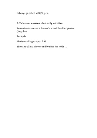 The document provides instructions for conversation practice activities. Learners are asked to make a video describing their daily routine and share the URL on YouTube. They are then asked to talk about someone else's daily activities, remembering to use the third person singular verb form (-s) when talking about the other person's routine.
