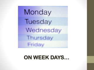 The document outlines a typical weekday and weekend routine. On weekdays, the person wakes up at 7am, brushes their teeth, takes a shower, gets dressed, eats breakfast at 7:30am, takes the bus to school at 7:40am, has lunch at 1pm, watches TV, does homework, and uses the computer after school. They have dinner with their family in the evening and go to bed at 9pm. On weekends, they play soccer with friends, go to the movies, hang out with friends, sometimes go to the mall, go to church on Sundays, and sometimes visit relatives.