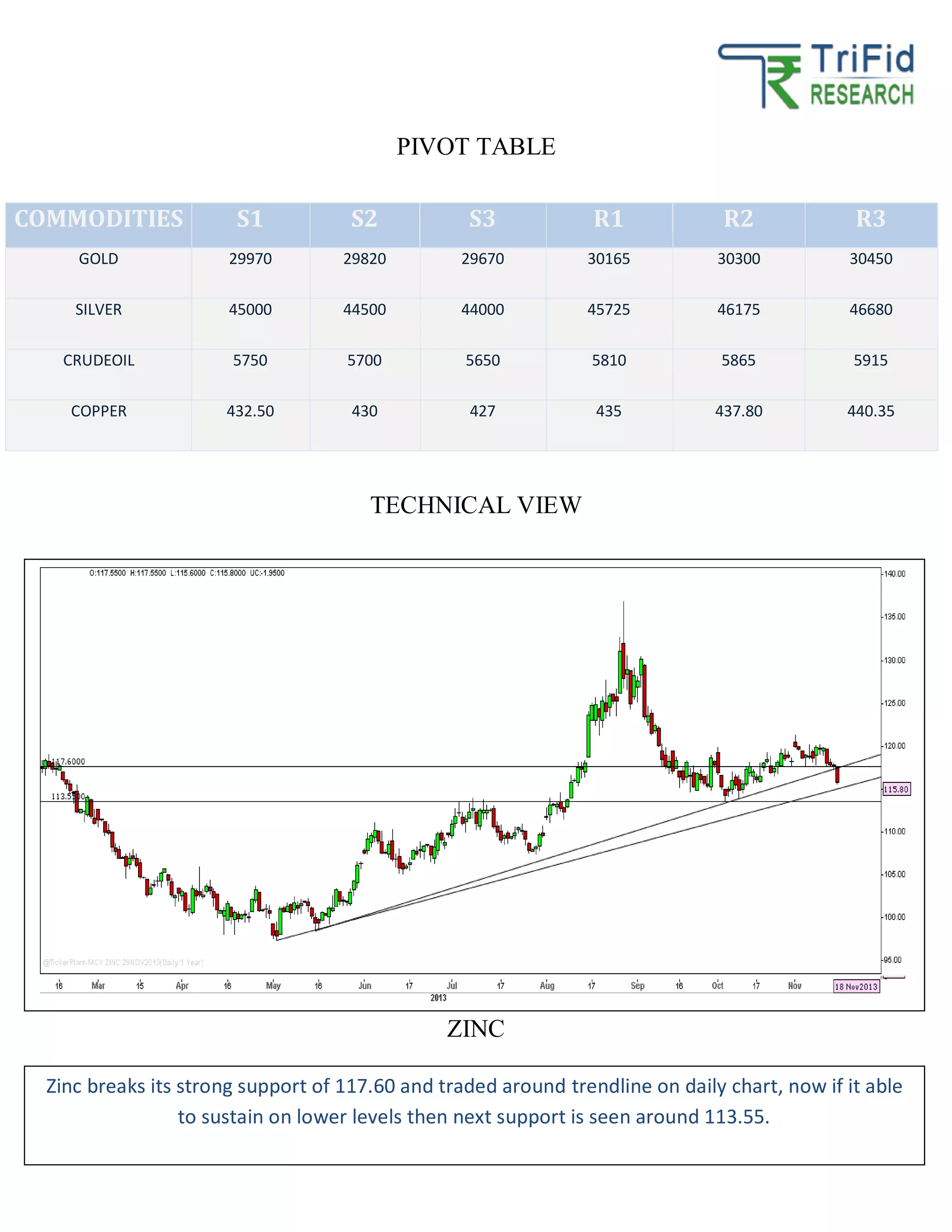 This document contains a pivot table showing commodity prices for gold, silver, crude oil, copper, and zinc on different dates. It also provides a technical view on zinc, noting that zinc broke a strong support level of 117.60 and is now trading around a trendline on the daily chart. If zinc is able to sustain itself at lower levels, the next support is seen around 113.55.