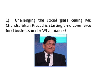 The document discusses three separate trivia questions: 1) The name of the e-commerce food business started by Mr. Chandra bhan Prasad. 2) The NGO that the advertising agency Native VML created an ad for. 3) The Italian footwear brand that pays homage to Marco Verratti, nicknamed "Gufetto," who is Michael Dupouy's favorite soccer player. The document provides these three trivia questions and directs the reader to a daily quiz blog for answers.