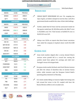 This document is a daily equity report published by CapitalStars Financial Research Pvt. Ltd. on August 7, 2014. It summarizes the day's performance of the Indian and global stock markets, including key index levels and sector performances. It also provides pivot point analysis and recommendations for various stocks and indices. The bottom section reports the quarterly earnings and financial results of various companies like Jindal Steel, Infosys, IDBI Bank, Piramal Enterprises, Apollo Tyres, Adani Ports, and Amara Raja Batteries.