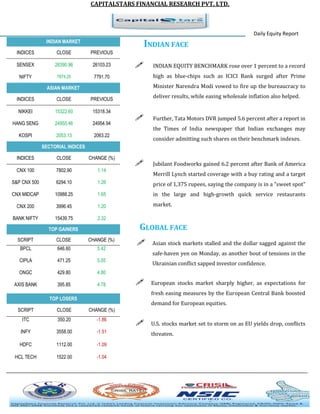 The document is a daily equity report from CapitalStars Financial Research Pvt. Ltd. summarizing the performance of the Indian equity market on August 19th, 2014. Key points include: