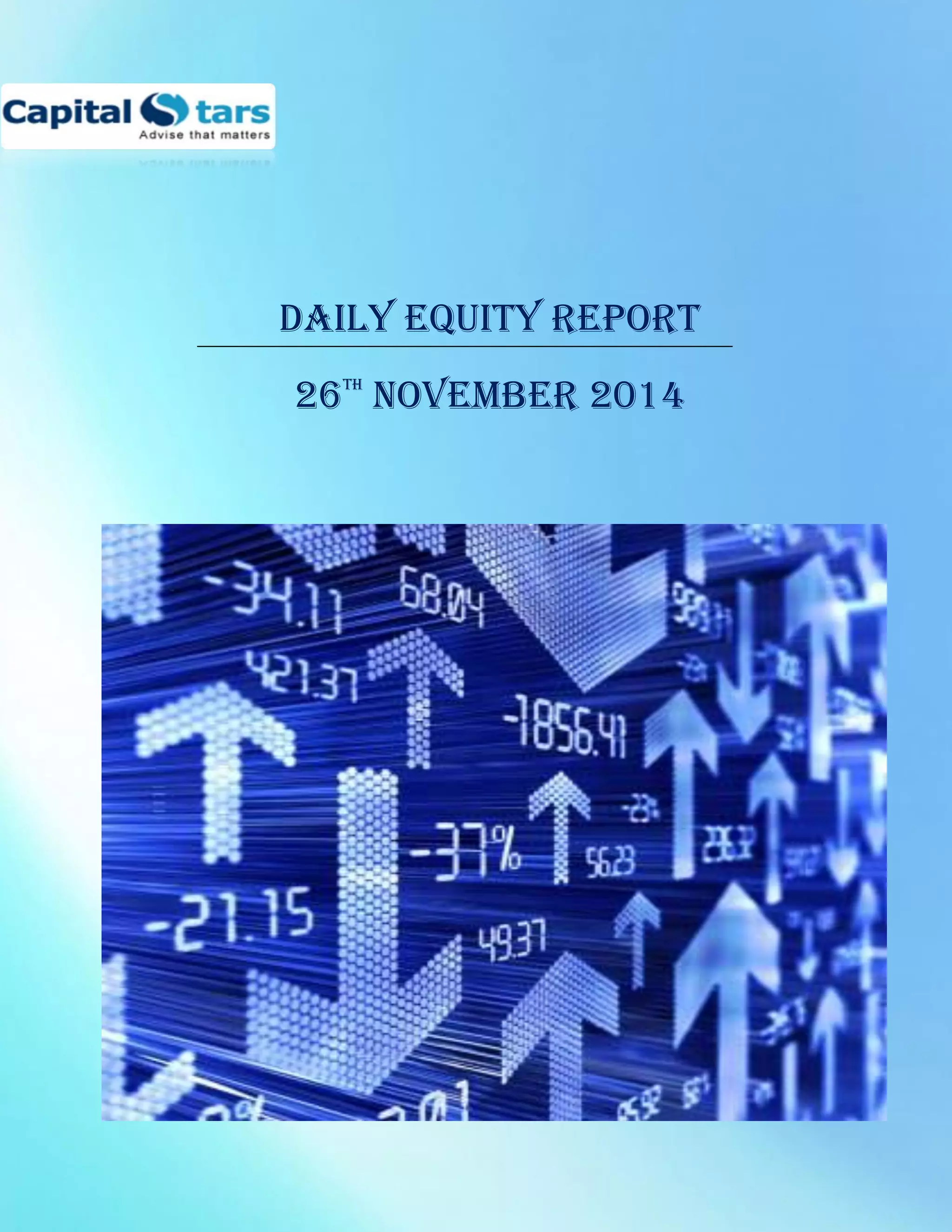 The daily equity report from CapitalStars Financial Research Pvt. Ltd provides an overview of the Indian and global markets. In India, key indices like the Sensex and Nifty fell from recent record highs as financial firms declined on concerns over delays to an insurance bill. Cox & Kings raised Rs. 1000 crore through a share issue to reduce debt. Globally, Asian shares started trading a new index and European shares paused after recent gains. In the US, futures pointed to small gains continuing the market's upward trend.