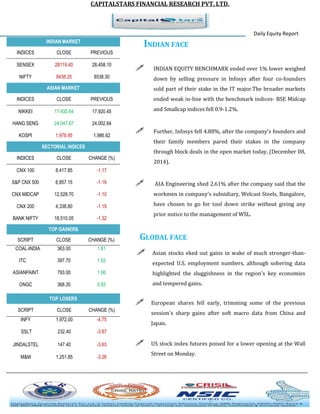 - Key Indian indices like Sensex and Nifty ended the day lower by over 1%, with Infosys falling the most at 4.88% after its founders sold stakes.
