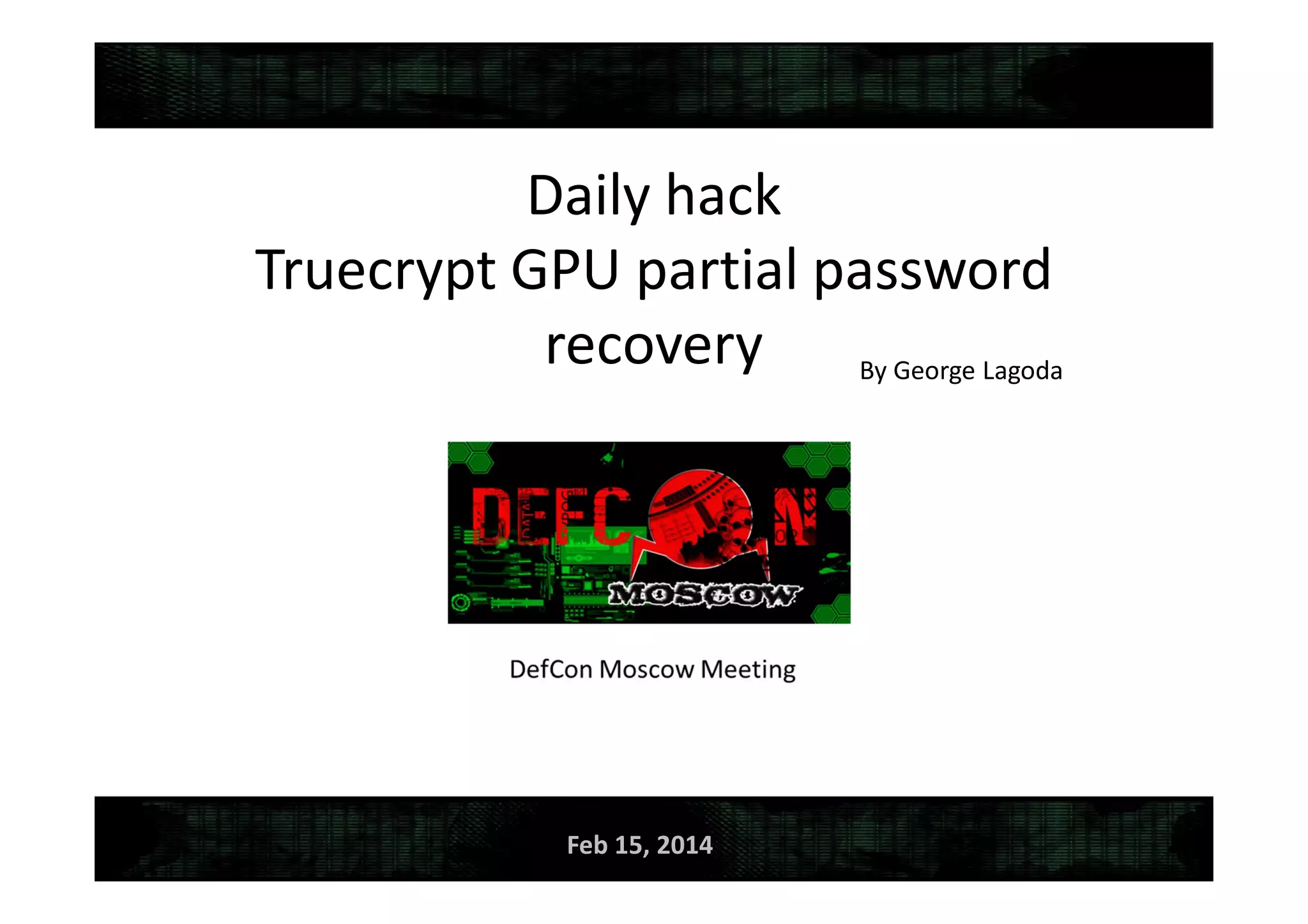 This document discusses tools for recovering a partially lost Truecrypt password using a GPU when 4-5 symbols of the password are unknown. It describes the tools TrueCrack and oclHashCat, how they work by using the salt and encrypted string in the Truecrypt header to brute force possible passwords, and provides an example command to use oclHashCat to try passwords with unknown case and symbols replaced with wildcards.
