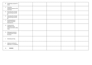 This document outlines a daily lesson plan for a class at Tubay National High School. The plan details the objectives, content, learning resources, procedures, remarks, and reflections for the lesson. It includes reviewing previous lessons, presenting new concepts, discussing and practicing skills, formative assessment, finding practical applications, making generalizations, and evaluating learning. The teacher notes the number of students who achieved mastery and required additional activities or remediation. Strategies that worked well and difficulties encountered are also reflected on.