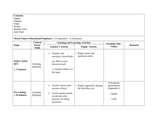 The daily lesson plan is for a Year 3 class on being healthy. The 60 minute lesson will involve students singing a song about foods, filling in blanks in the song lyrics, and discussing examples of healthy and unhealthy foods in groups. The objectives are for students to sing the song with correct pronunciation, list examples of healthy and junk foods, and fill in 4 out of 6 blanks in the song correctly. The lesson will begin with an introduction on foods, presenting pictures, playing the song twice while students fill in the worksheet, discussing the filled worksheet, and ending by having student groups list examples of healthy and junk foods.