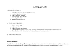 The lesson plan is for a 4th semester class at the Universidad Nacional de Chimborazo on May 27, 2013. The topic is "A Different Path to Justice" and the objective is for students to express their own points of view in writing and orally and justify them critically. The lesson involves reviewing simple past tense and short/full answers, predicting topics of an interview, reading about DNA databases, and two tasks for students to answer questions and comment on academic texts. The lesson will use various materials and last a total of 50 minutes divided between several activities.