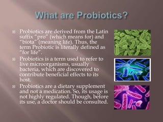 Probiotics are live microorganisms, primarily bacteria, that provide health benefits, particularly in maintaining digestive health and restoring the balance of good bacteria in the gut. They can help alleviate various digestive issues, enhance immune function, and may even improve cardiovascular health. Probiotics can be obtained from dietary supplements and certain foods, and while generally safe, it is recommended to consult a doctor before use, particularly in individuals with health issues.