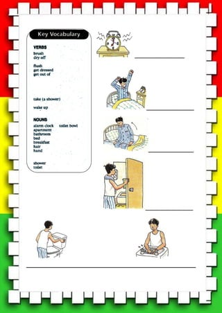 This document provides a grammar target and questions for describing a daily morning routine using simple present tense verbs. It includes a warm up activity to underline verbs in a sample text. The target is using simple present tense to describe daily habits like waking up, getting dressed, eating breakfast, and going to school. It then provides 5 sample questions to elicit simple present tense verb responses from students about their typical morning routine.