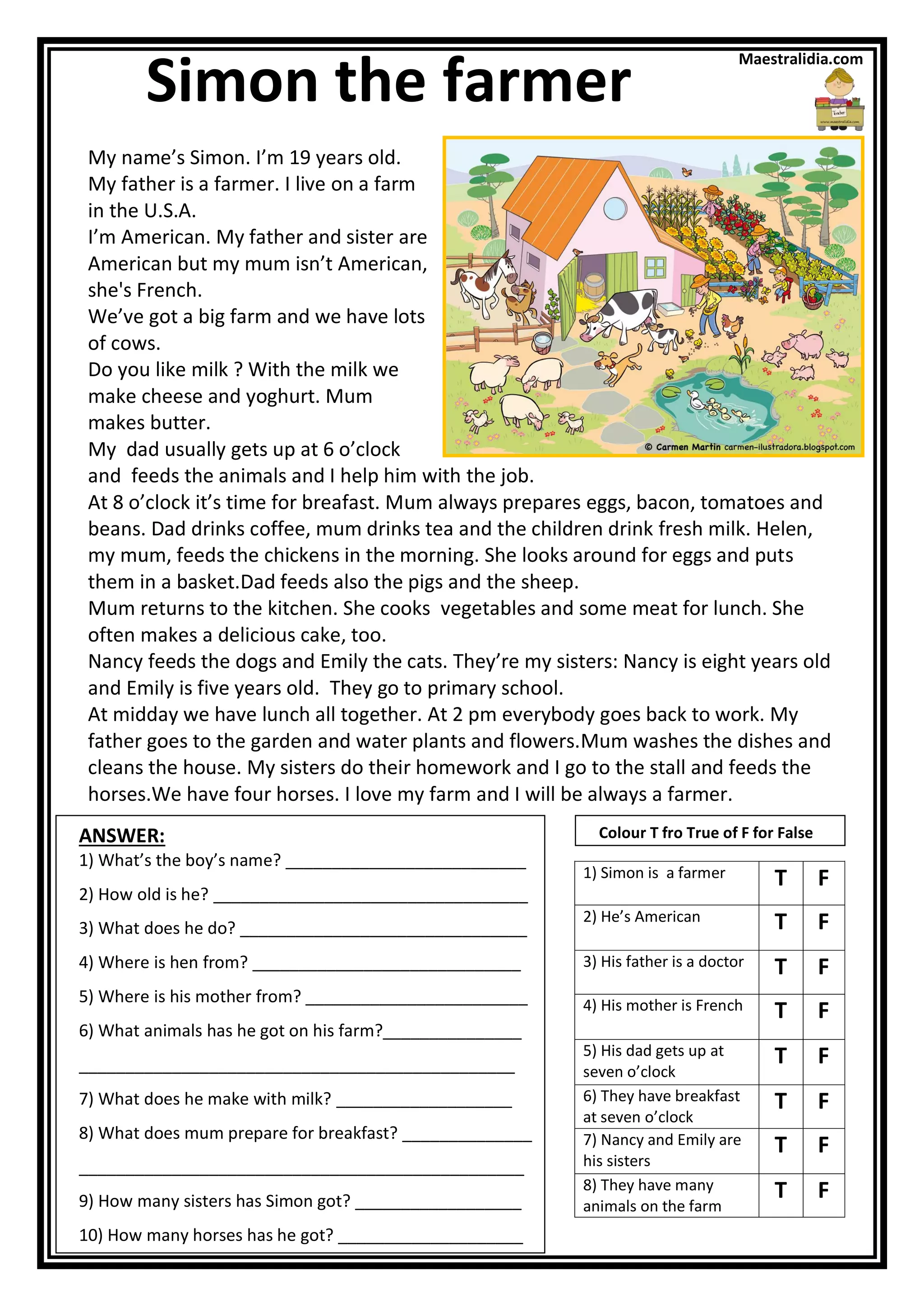 Simon is a 19-year-old American farmer who lives on a farm in the U.S. with his American father and sisters, but his mother is French. He helps his father take care of their farm, which has cows, pigs, sheep, horses, chickens, dogs, and cats. A typical day on the farm involves feeding the animals, having breakfast with the family, and doing chores before lunch and returning to work in the afternoon.