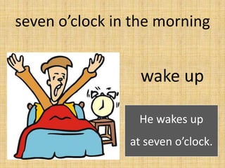 The document outlines a typical daily routine for a student, including waking up at 7am, showering and getting dressed, having breakfast at 8am, brushing teeth at a quarter past 8am, going to school at half past 8am, returning home at 5pm, having a snack at a quarter past 5pm, studying from half past 5pm to 7pm, having dinner at 8pm, watching TV from 9pm to 10pm, and going to bed at 10pm.
