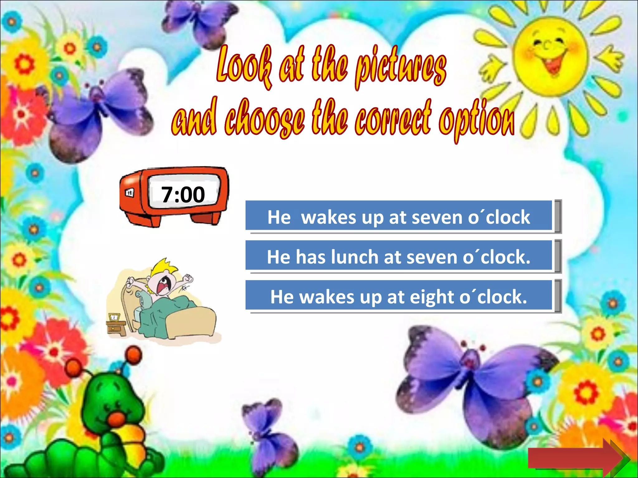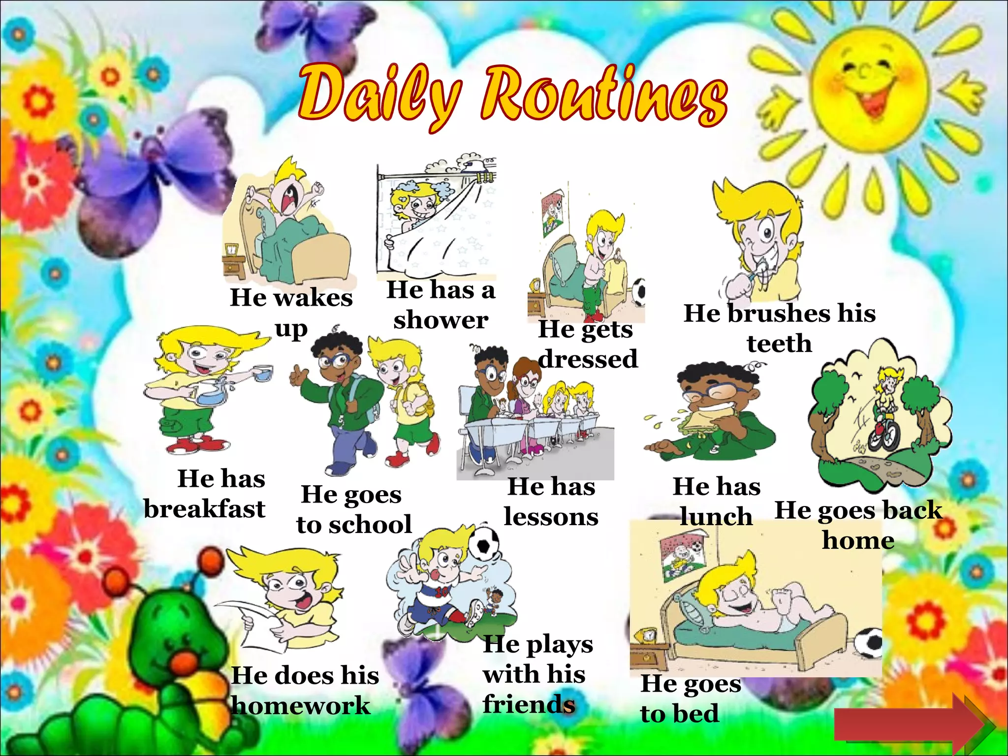 He wakes up at 7:10am and has a shower. At 8am he goes to school. At midday he has lunch. At 4:30pm he goes back home, does his homework from 5:15-5:45pm, and plays with his friends from 5:45-6:15pm. At 10pm he goes to bed.