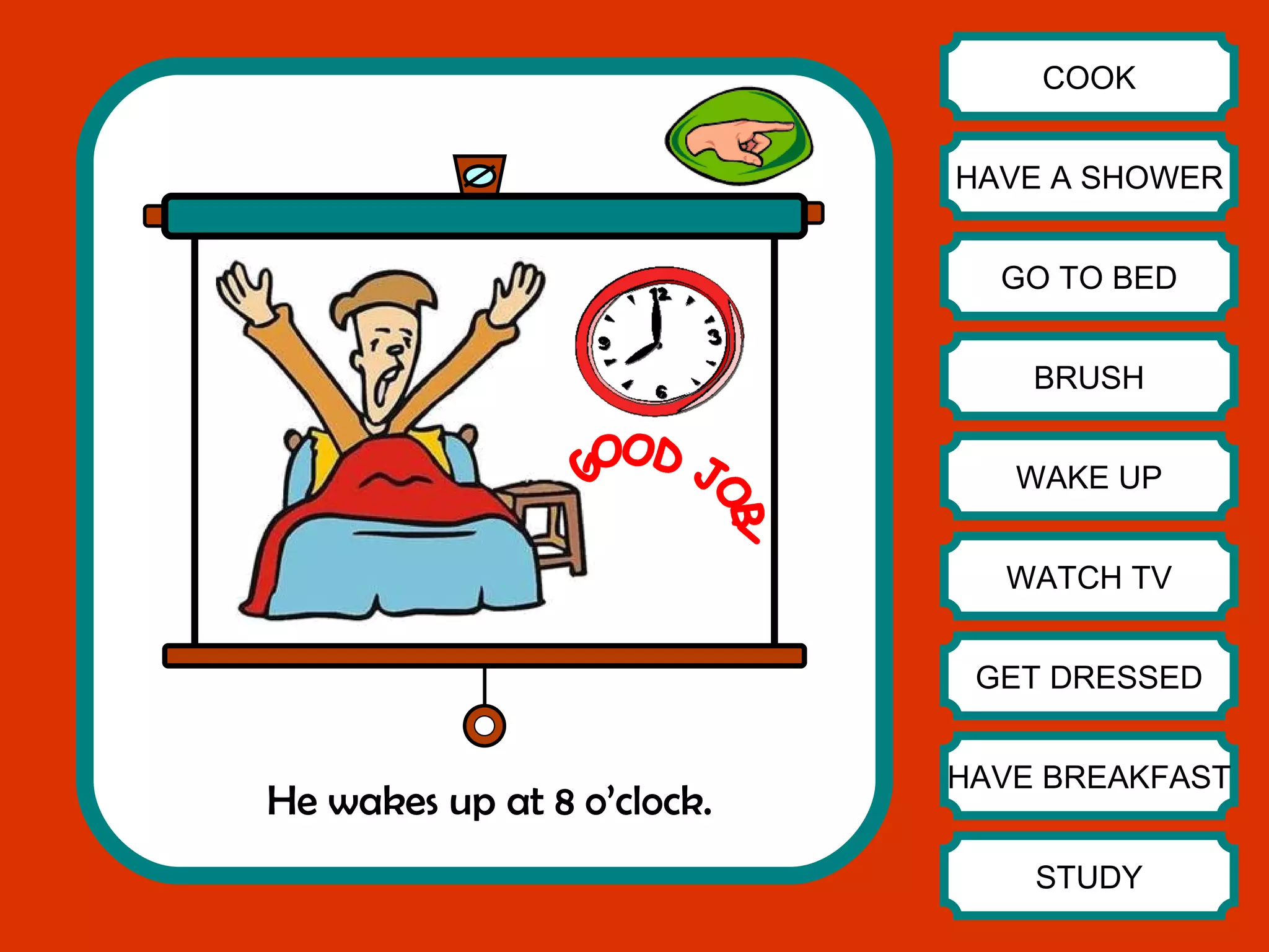 The document describes a person's daily routine, which includes waking up at 8 AM, taking a shower at 8:15 AM, getting dressed at 8:25 AM, eating breakfast at 8:30 AM, brushing their teeth daily, studying English, usually cooking dinner, watching TV before bed, and going to bed at 10:30 PM.