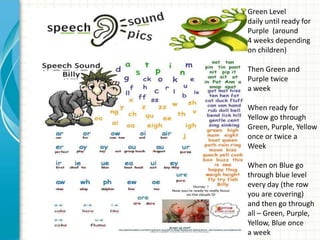 The document outlines a systematic phonics program that progresses through different color-coded levels (green, purple, yellow, blue) based on children's readiness, emphasizing daily practice of relevant sound pictures and decoding high-frequency words. It includes numerous playful phrases and jingles for each sound to aid learning, and instructions for adding new words to children's folders as they progress. Additional resources are provided for purchasing related materials and accessing phonics songs.