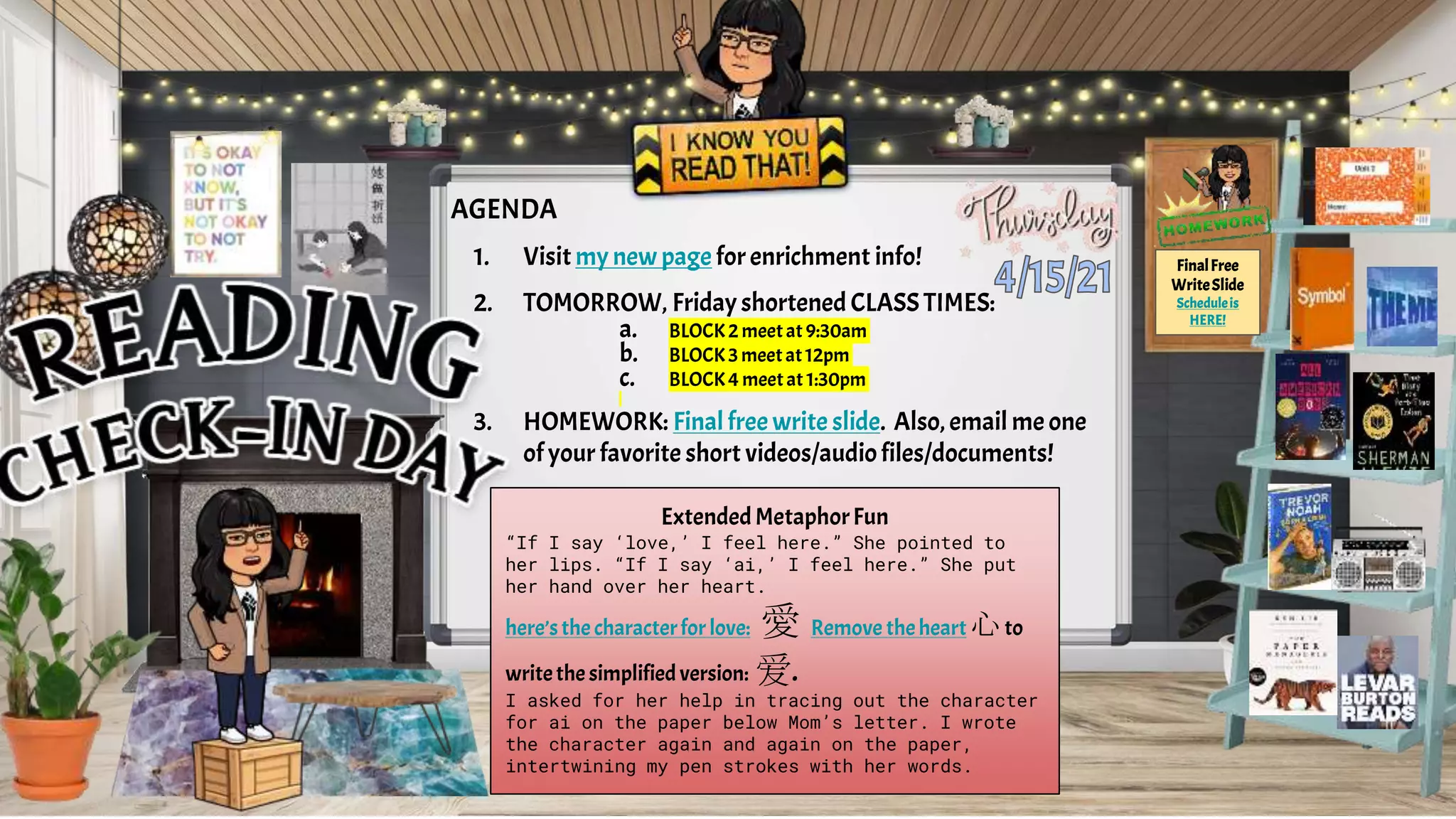 The document outlines various academic tasks and schedules for students, including shortened class times and assignments such as literary terms tests and final writing projects. It emphasizes the importance of submitting work by specified deadlines and engaging in discussions around assigned texts. Additionally, it provides reminders for various class activities and optional resources for student support.