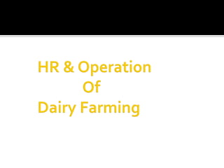 The document discusses establishing a dairy farm business in Varanasi, India. It provides details on the production, marketing, financials, operations, and human resource management of the dairy farm. Key points include producing over 125,000 liters of milk annually, earning over Rs. 30 lakhs in revenue, employing 7 people, and involving milking cows twice daily.
