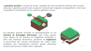 Il giardino pensile è un'area verde costruita su superfici elevate come tetti, destinata a migliorare il microclima e l'estetica degli edifici. Esistono diverse tipologie di giardini pensili, tra cui estensivi, inclinati, intensivi leggeri e pesanti, ognuna con specifiche esigenze di installazione e gestione. Tra i vantaggi ci sono l'isolamento termico, la riduzione del rumore e un incremento del valore immobiliare.