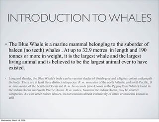 The Blue Whale is the largest animal to ever exist, reaching up to 32.9 meters long and 190 tons. It has three distinct subspecies found in different ocean basins. Blue Whales were nearly hunted to extinction by whaling but are now protected. Their populations have rebounded slightly but remain much smaller than before whaling. Blue Whales mostly travel alone or in small groups and communicate over long distances using low-frequency sounds. They feed primarily on krill in cold waters and migrate to warmer waters to breed and give birth.