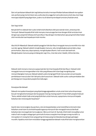 Dakwah merupakan kewajiban setiap Muslim untuk menyeru manusia kepada ajaran Islam dan kebaikan, sesuai dengan kemampuan masing-masing. Tugas ini adalah perlaksanaan perintah Allah yang diwariskan kepada Nabi Muhammad SAW, dan melibatkan usaha untuk mengajarkan kebenaran serta mencegah kemungkaran. Selain itu, dakwah juga mencakup mendidik masyarakat agar hidup dalam harmoni dengan petunjuk agama demi kebahagiaan di dunia dan akhirat.