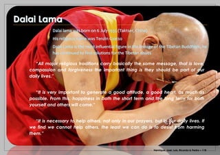 The Dalai Lama, born Tenzin Gyatso on July 6, 1935, is a key figure in Tibetan Buddhism advocating for love, compassion, and forgiveness across all religious traditions. He emphasizes the importance of cultivating a good heart for personal and communal happiness. The Dalai Lama encourages actions to help others in daily life, even if it means refraining from causing harm.