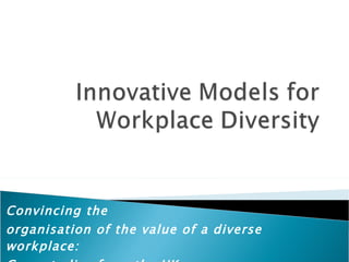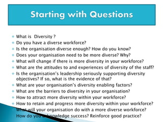 The document discusses diversity in the workplace and making organizations more inclusive. It defines diversity and looks at valuing, managing, and developing diversity capability at the individual and organizational levels. Barriers to diversity are addressed, as well as the business case for diversity, which includes increased creativity, innovation, better decision-making, and attracting top talent. Metrics for assessing diversity climate and intercultural development are also presented. Overall, the document provides strategies for organizations to promote diversity and inclusion.
