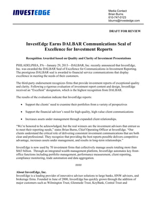 InvestEdge earned the DALBAR Seal of Excellence for Communications in Investment Reporting. This prestigious award recognizes firms that provide investment reports of exceptional quality and clarity. Following an evaluation of its investment report content and design, InvestEdge received an "Excellent" designation, which is the highest recognition from DALBAR. InvestEdge reports support clients' needs to examine portfolios from different perspectives and help financial advisors provide high-quality client communications, increasing assets under management. InvestEdge is used by 70 investment firms managing over $663 billion in total assets.