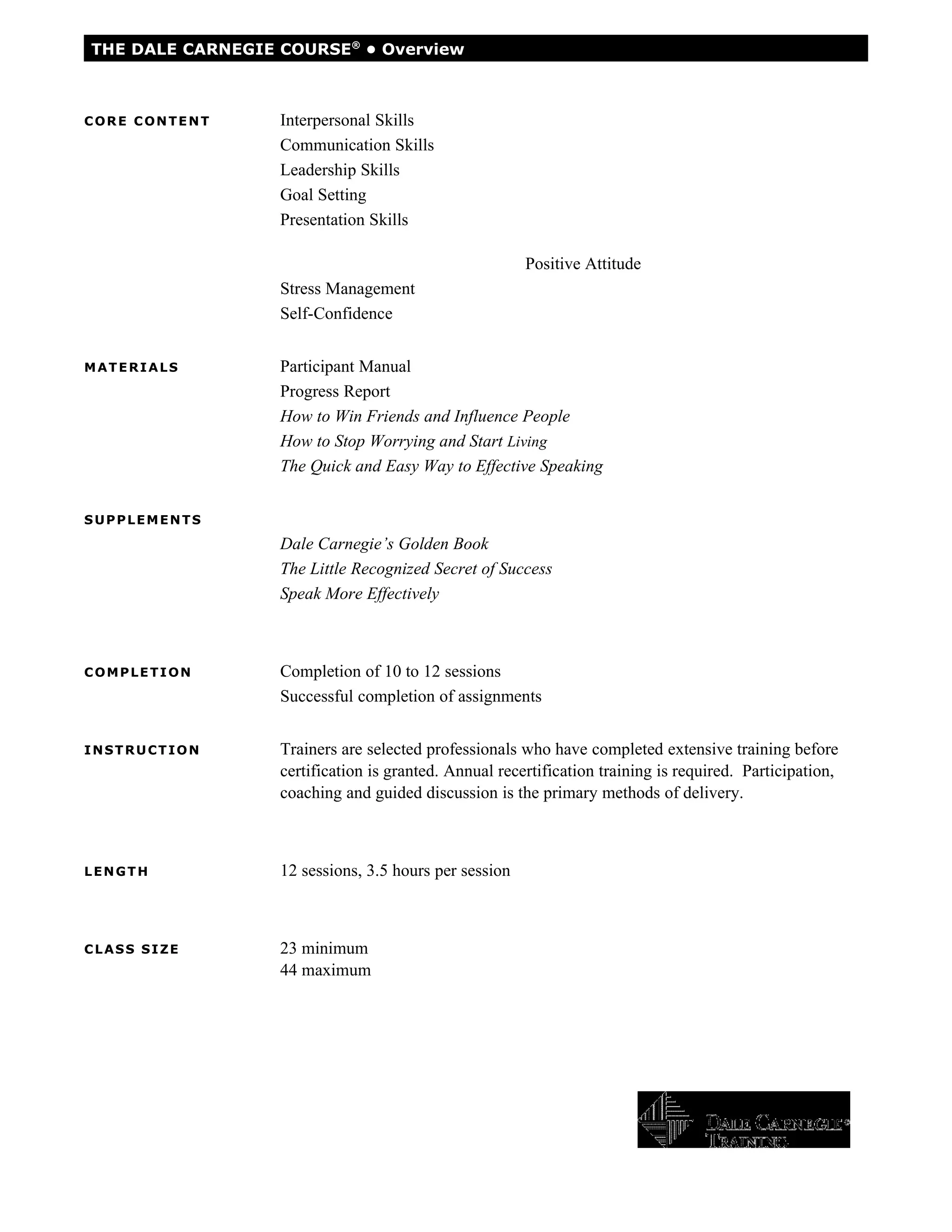 The Dale Carnegie Course is a 12-session program that teaches interpersonal skills, communication skills, leadership skills, and more. Sessions use participation, coaching, and discussion to teach skills like recalling names, self-confidence, stress management, public speaking, building relationships, and setting goals. Trainees work through a participant manual, complete assignments, and receive certificates upon successful completion.