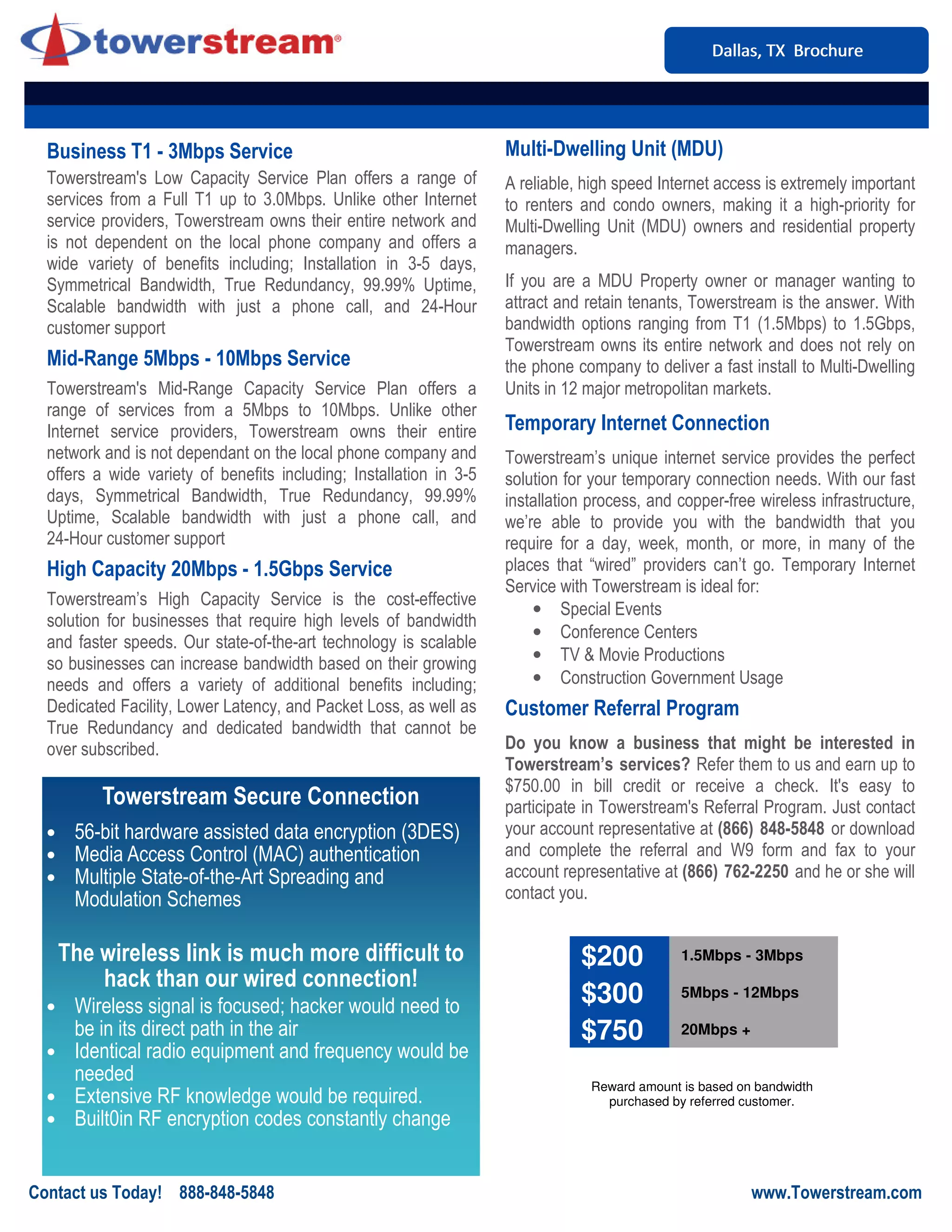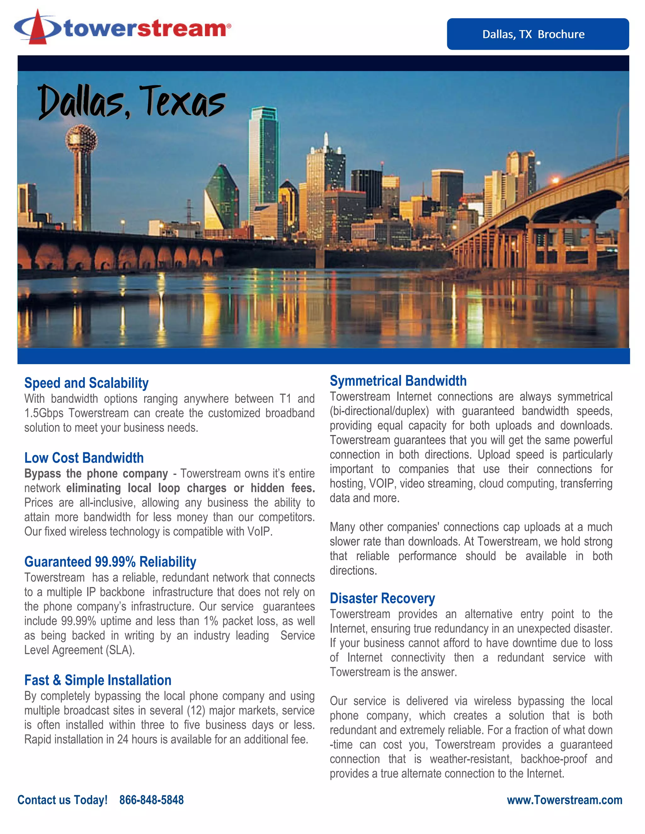 Towerstream offers wireless broadband internet solutions for businesses with speeds ranging from 1.5Mbps to 1.5Gbps. They own their entire network, bypassing phone companies to eliminate fees while providing reliable, redundant connections with 99.99% uptime. Installation is fast, within 3-5 business days, and bandwidth is symmetrical for equal upload and download speeds.