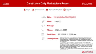 The Dallas Daily Marketplace Report from Carstir.com contains listings of used vehicles for sale from private parties in the Dallas area. The report includes 16 listings of various makes and models from 2011 to 2015 with prices ranging from $3,800 to $52,500. Contact information like phone numbers, emails, and descriptions of vehicle features and condition are provided for interested buyers to learn more.