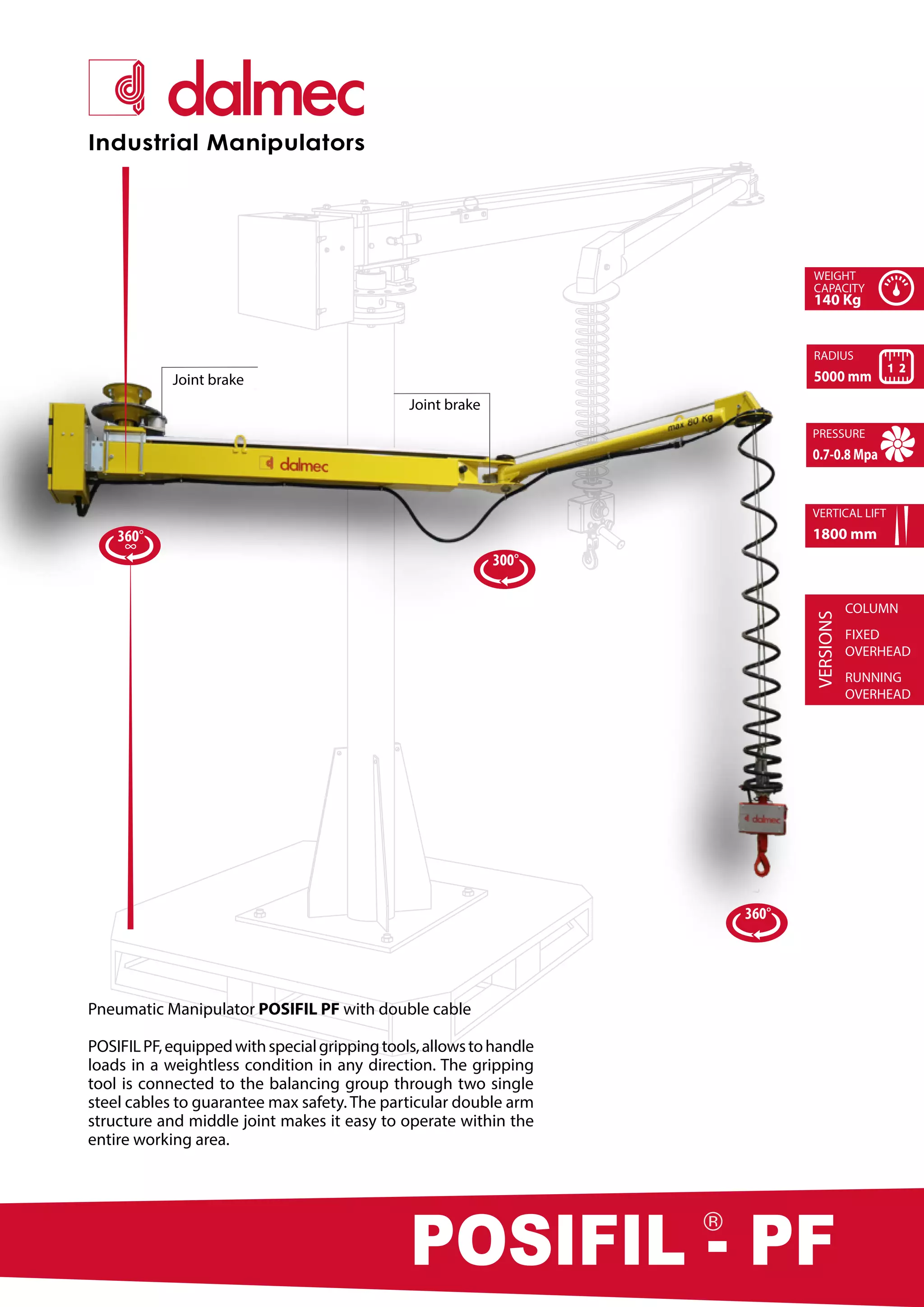 The document describes the Posifil PF industrial manipulators, which are pneumatic devices designed to handle loads up to 140 kg in a weightless condition. They feature a special gripping tool connected to a balancing group via steel cables for safety and are versatile in operation, with versions for different mounting configurations. The technical specifications include a maximum radius of 5000 mm, a vertical lift of 1800 mm, and an air supply requirement of 0.7-0.8 mpa.