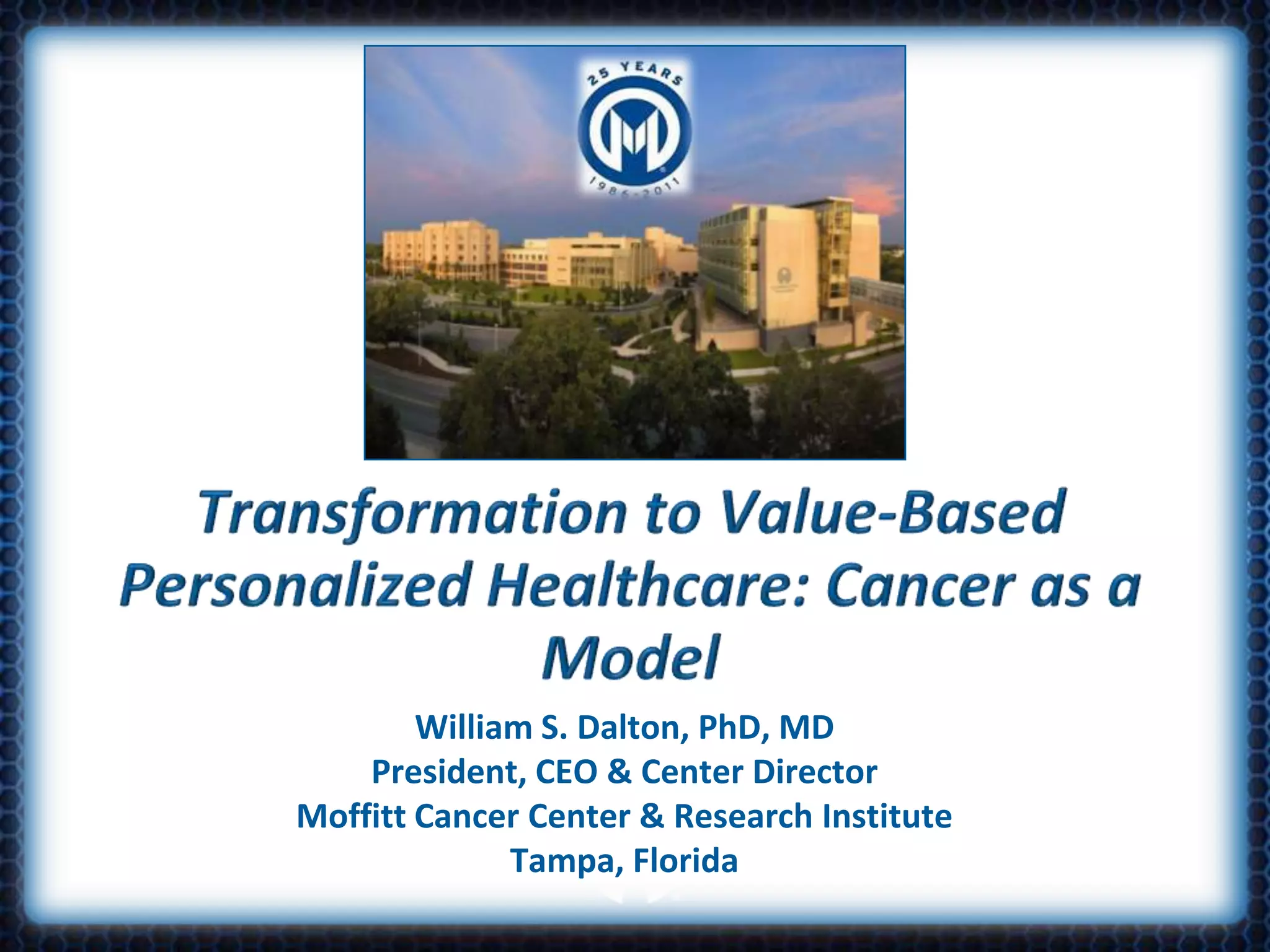 - The document discusses the Total Cancer Care (TCC) approach at Moffitt Cancer Center, which aims to provide personalized cancer care through comprehensive data collection and analysis.