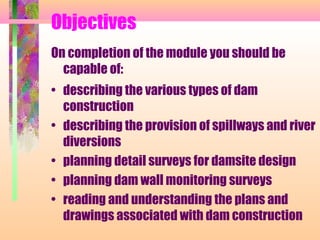 This document discusses dam construction, including the types of dams, factors considered in site investigations, construction processes, and key elements. It describes the main types of dams as earth, rock, concrete, and their subclasses. Investigation factors include geology, hydrology, materials availability, and environmental impacts. Construction involves river diversion, placement of impervious cores and drainage layers, grouting, and addition of spillways and monitoring systems. Concrete dams are built using solid gravity, arch, buttress, or prestressed concrete designs suited to site conditions.
