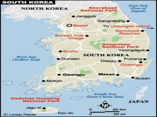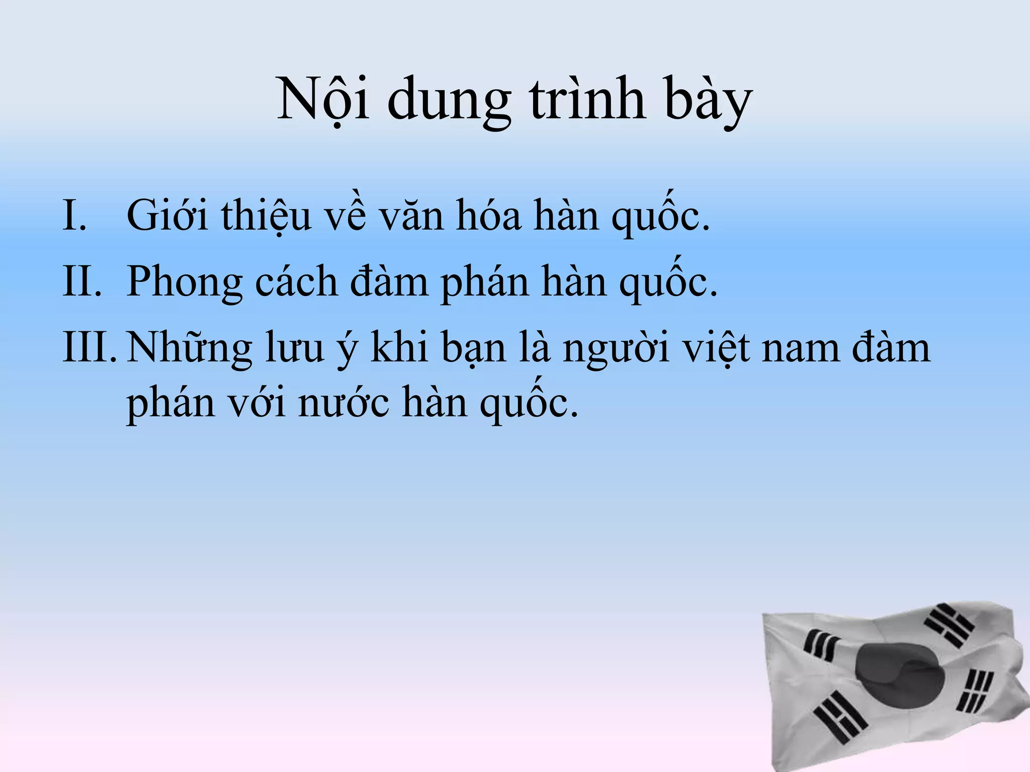 Tài liệu giới thiệu về văn hóa Hàn Quốc bao gồm thông tin về đất nước, trang phục, ẩm thực, ngôn ngữ, phong tục, lễ hội và kiến trúc. Nó cũng nêu rõ phong cách đàm phán của người Hàn Quốc, nhấn mạnh tầm quan trọng của xây dựng mối quan hệ, niềm tin, và giới thiệu trong các cuộc thương lượng. Cuối cùng, tài liệu đưa ra các lưu ý cho người Việt Nam khi đàm phán với đối tác Hàn Quốc, bao gồm chuẩn bị thông tin, không gian, và giao tiếp.